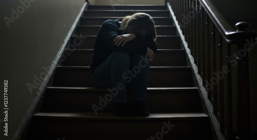 Woman Sitting Alone On Dark Staircase Feeling Sad