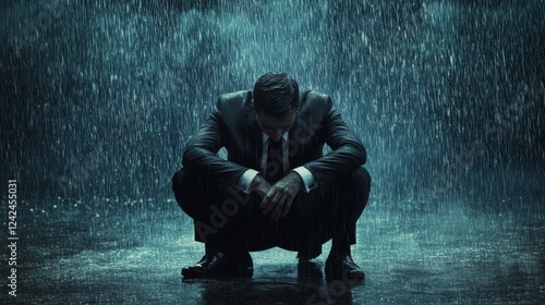 107.A dejected businessman seated in the rain, his head resting on his knees, with raindrops streaming down his face and soaking through his dark suit.