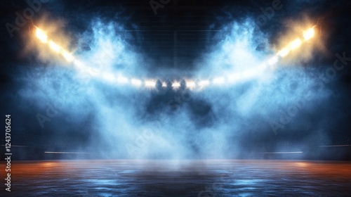 Dramatic Lighting Effects in a Sports Arena with Bright Lights, Fog, and Dynamic Atmosphere for Event Photography and Graphic Design