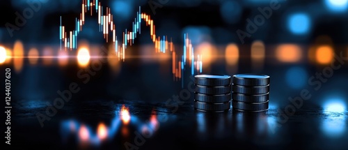 Dynamic financial market graph with stacks of coins symbolizing investment and growth potential in modern economy.