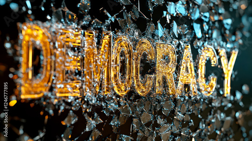 Word "Democracy" on black shattered glass - key principle of western civilization being destroyed