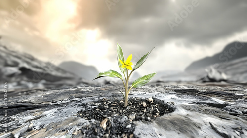 Yellow bloom sprouting on barren land shows resilience against grey desert with dramatic sky. Symbol of hope, renewal, ecological recovery