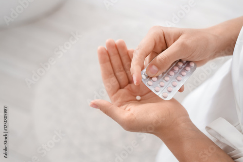 Young woman taking oral contraceptive pill in bathroom, closeup