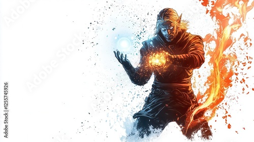 a hero casting a glowing defense spell with light orbs, fantasy magic, bold and radiant, isolated on white background