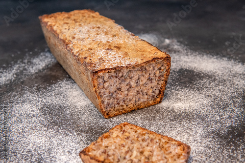 #1255805678Świeżo upieczony bochenek chleba pełnoziarnistego z kromkami na blacie posypanym mąką. Koncepcja domowego pieczenia, zdrowego odżywiania i rzemieślniczej żywności