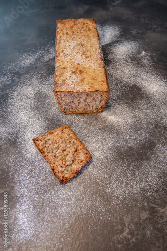 #1348631481Integral bread in the form of a triangle with linseed, oats and sesame seeds on a black slate table
