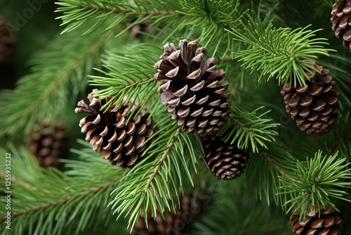 #845387318Image of pine cones nestled among lush evergreen branches, evoking a natural winter feel, embodying tranquility and rustic beauty.