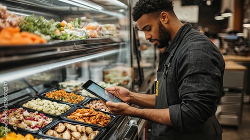 #475604216Smiling asian bakery owner in apron presents his selection of fresh pastries