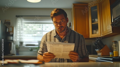 Displeased homeowner with unexpected utility bills. Featuring a bill on a kitchen counter