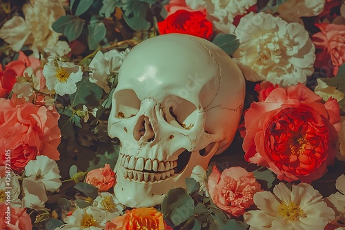 Macro shot of a skull among florals with soft cinematic lighting and bokeh effect.