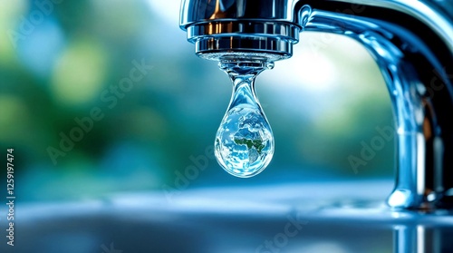 Water drop shaped like planet Earth falling from a faucet