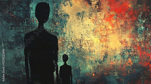Two faceless figures standing against grunge background
