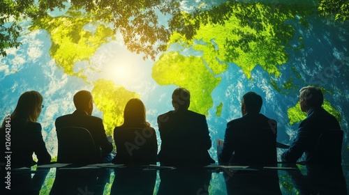 #919755580A mysterious group of figures wearing hooded jackets shrouded in green mist, creating an eerie atmosphere in a dark forest.