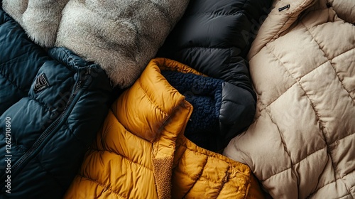 A pile of trendy winter jackets with various textures, such as puffer and fleece, stacked on top of each other.