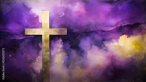 Watercolor cross background in blended shades of purple and gold, symbolic and reverent atmosphere, evoking the significance of Maundy Thursday with copy space