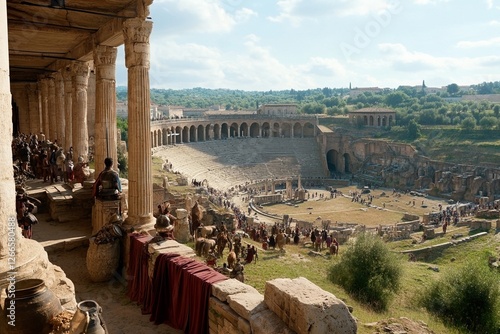 Vista de un anfiteatro romano en la antigüedad, con ciudadanos y soldados reunidos en un día de espectáculo, reflejando la grandeza de la civilización romana
