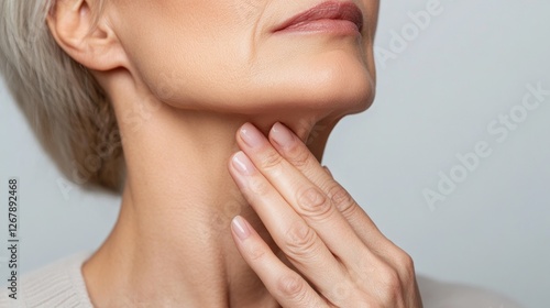 Mature caucasian female examining neck skin, close-up view on aging. Facial Fillers and Cosmetic Injections. Anti-wrinkle injections, Botox and fillers. Menopause Skin Care