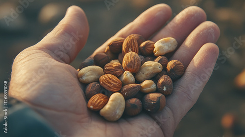 A handful of fresh mixed nuts held in a person's hand