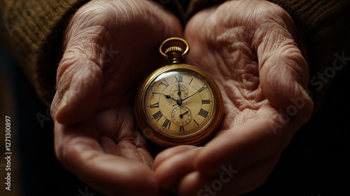 Weathered hands cradle a vintage pocket watch, symbolizing the passing of time and cherished memories held dear through generations.