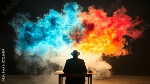 A man sits at a desk, contemplating a vibrant explosion of blue and red smoke behind him. A dramatic and thought-provoking scene.