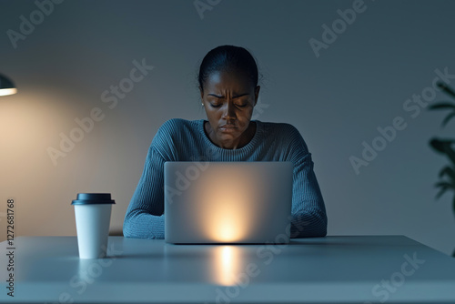 A minimalist desk with a laptop glowing softly, A focused woman working late at a desk, illuminated by the glow of her laptop, with a coffee cup by her side in a dimly lit room.