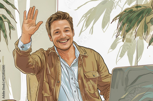 Ilustrowany uśmiechnięty mężczyzna machający w biurze.