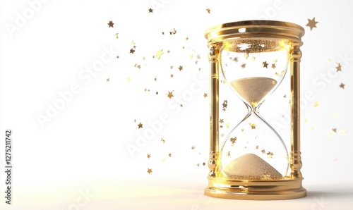 A golden hourglass with flowing sand and sparkling stars, symbolizing the passage of time