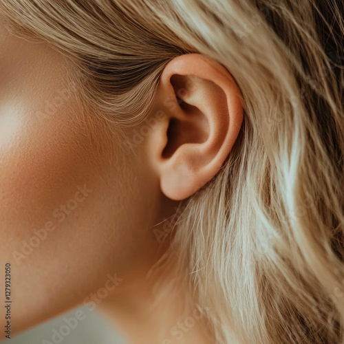 close-up of a blonde's ear in soft lighting. Mockup for displaying jewelry and jewelry