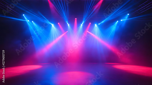 Red and blue laser light for concert background. Dance party event with lazer circle design for dj. Night strobe performance with sparkle and steam. Realistic nightlife bg. Vibrant virtual technology