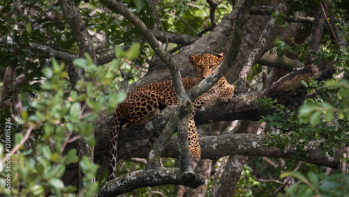 Wild Sri Lankan leopard in Wilpattu National Park of Sri Lanka spotted in trees staring directly at camera during wildlife safari