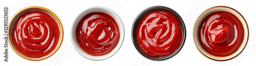 Set of red ketchup bowls, top view, isolated on transparent cutout background