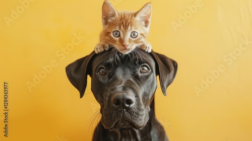 Adorable Kitten on a Dog's Head: A heartwarming image of interspecies friendship.