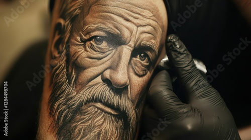 Realistic tattoo of elderly caucasian man's face by tattoo artist