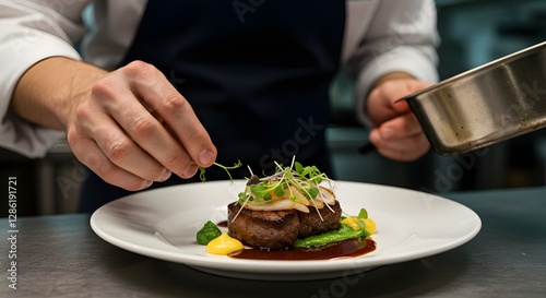 Maestro chef cocinero hombre manos cocinando con precisión aderezo preparando sabroso fresco delicioso delicioso plato gourmet comida en el plato para los clientes restaurante de 5 estrellas michelin