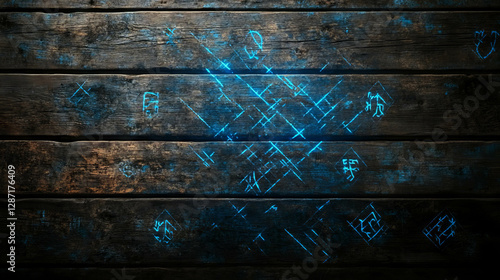 Mysterious wooden texture with glowing blue runes for magical design projects