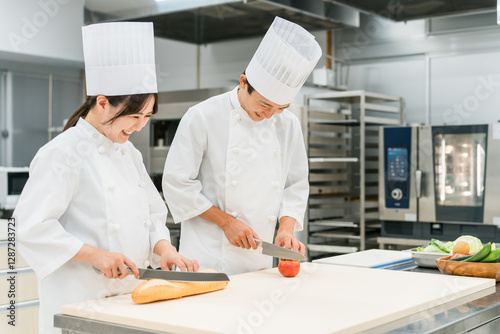 キッチンで仕込みをするコックコート姿の男女スタッフ(調理師・料理人・生鮮市場・食品加工)