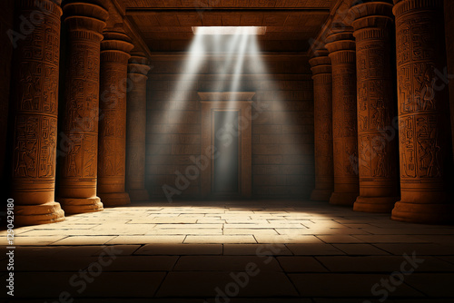 Ancient Egyptian temple interior with illuminated columns and doorway, showcasing intricate carvings and mystical atmosphere