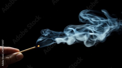 A hand delicately holds a matchstick ignited at one end, releasing wisps of soft gray smoke that swirl gracefully against a dark background. This ephemeral display captivates the viewer
