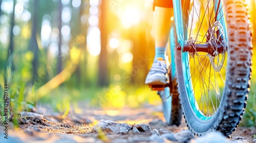 Mountain biker navigating a forest trail during golden hour with bright sunlight filtering through trees