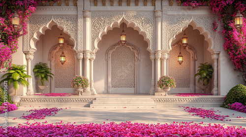 A gold podium surrounded by lotus petals and lanterns, set within an Indian palace's royal archway courtyard. Symbolizes royalty, tranquility, and cultural elegance with modern copy space