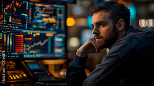 Serious businessman analyzing financial data on multiple screens in a dark office work stock night