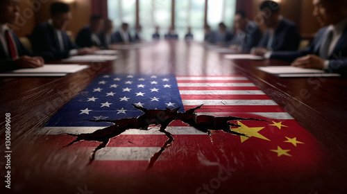 A shattered American flag on a conference table, with diplomats in the background signing new agreements