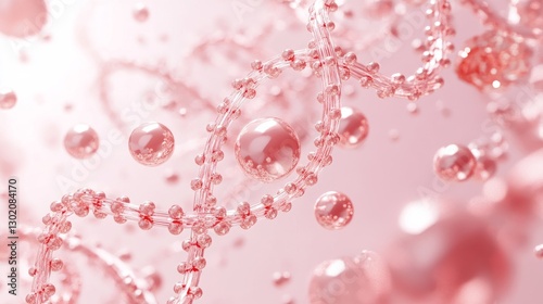 elegant 3D visualization of rose gold collagen peptides flowing in crystalline solution, DNA double helix structures floating gracefully around central molecule, pearlescent pink background with