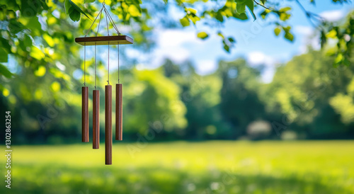 A lovely wooden wind chime sways from a branch, creating soothing sounds in a gentle breeze amidst vibrant greenery