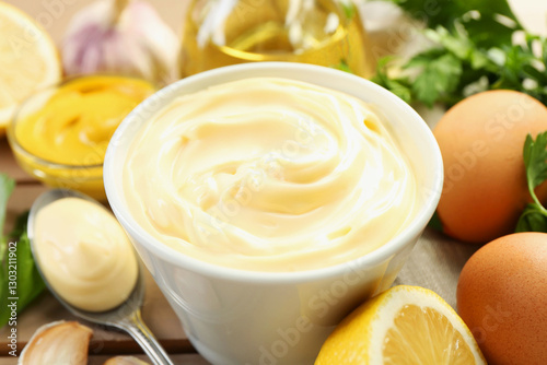 Delicious mayonnaise sauce in bowl and ingredients on table, closeup