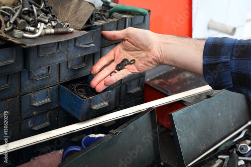 Uszczelki. Warsztat mechanika, mężczyzna szuka śruby.