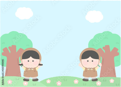 견학 숲체험 잔디밭 봄풍경 자연풍경 견학명찰 일러스트