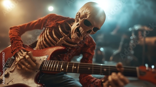 A creatively designed skeleton plays electric guitar with enthusiasm in a lively environment, combining humor with a passion for music, appealing to all audiences.