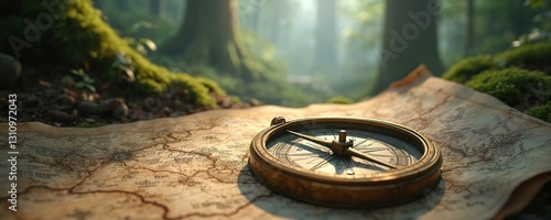Close-up shot of antique compass on old map in enchanted forest, guiding through fairytale. Rustic navigation tool shows direction for adventure, discovery, treasure hunting, exploring geography,