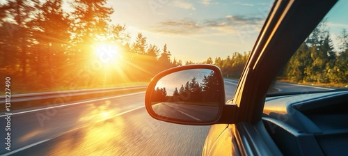 Il sole splende attraverso lo specchietto retrovisore di un'auto, creando un'atmosfera luminosa e calda.